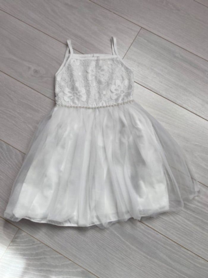 Robe longue blanche avec voile et dentelle. Jupon en bas. Pas transparent. longueur jusqu’au cheville. Porté une fois très bon etat. Mis pour ma fille de 4 ans et demie mais un peu large sur les cotés donc j’ai réajuster en couture et cela ne se voit pas.