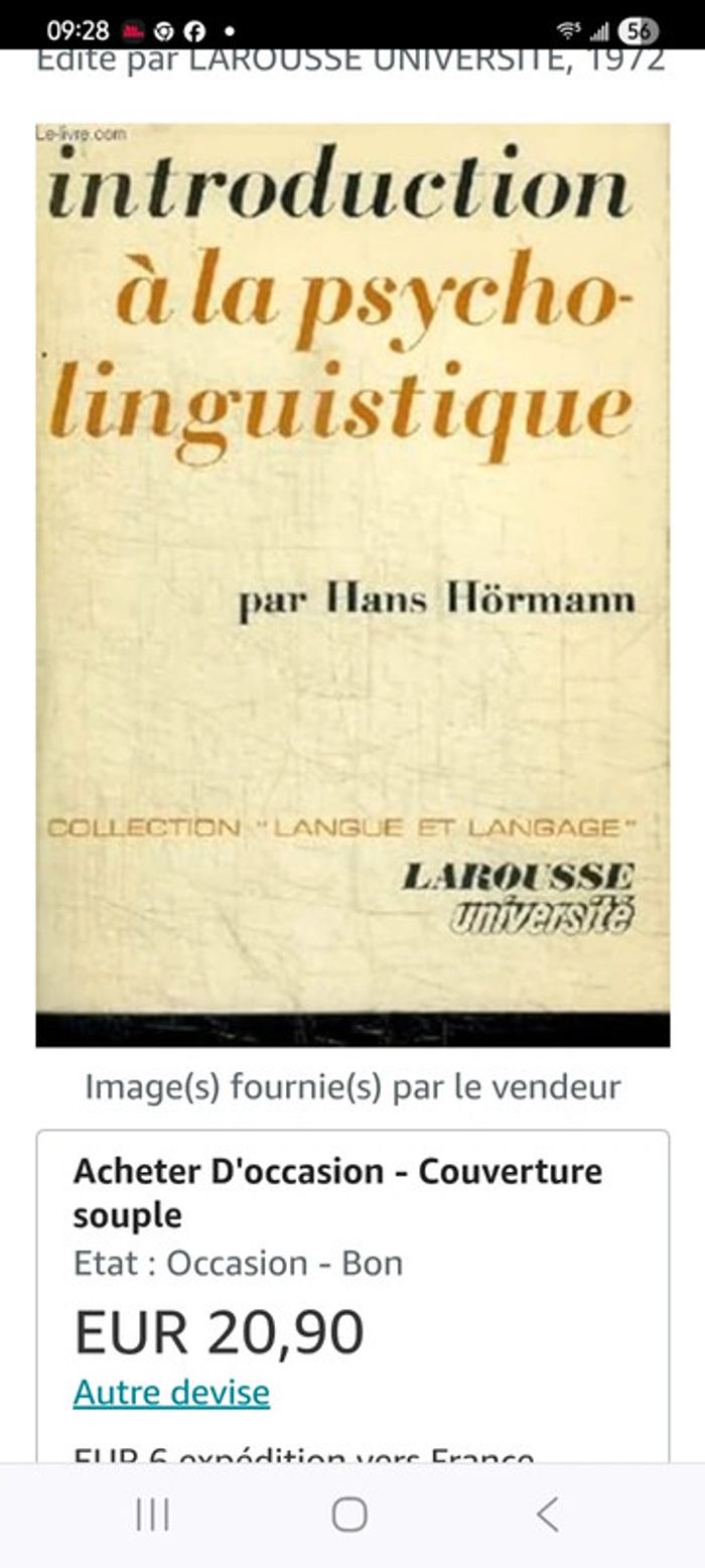 INTRODUCTION A LA PSYCHOLINGUISTIQUE. Hans Hörmann. Librarairie Larousse Bon état, usure du temps, et quelques annotations au crayon, lignes surlignees. Peu de dispo sur internet... Envoi rapide et soigné Vous pouvez si vous le souhaitez composer un lot, ainsi pour ne paierez qu une seule fois les frais d envoi...👍🌞😸