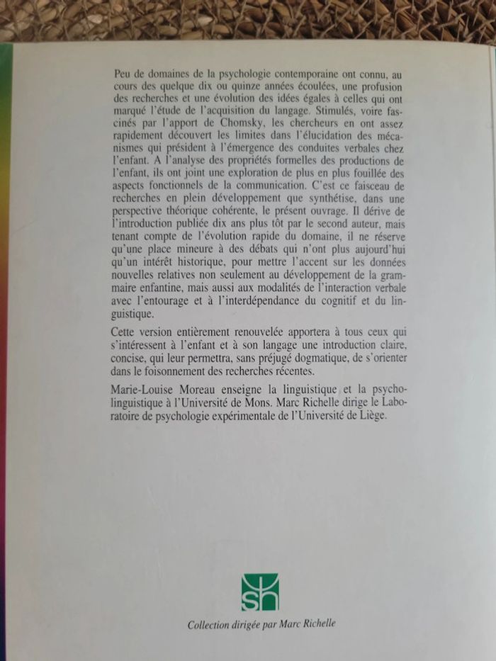 Peu de domaines de la psychologie contemporaine ont connu, au cours des quelque dix ou quinze années écoulées, une profusion des recherches et une évolution des idées égales à celles qui ont marqué l'étude de l'acquisition du langage. Stimulés, voire fascinés par l'apport de Chomsky, les chercheurs en ont assez rapidement découvert les limites dans l'élucidation des mécanismes qui président à l'émergence des conduites verbales chez l'enfant. A l'analyse des propriétés formelles des productions de l'enfant, ils ont joint une exploration de plus en plus fouillée des aspects fonctionnels de la communication. C'est ce faisceau de recherches en plein développement que synthétise, dans une perspective théorique cohérente, le présent ouvrage. Il dérive de l'introduction publiée dix ans plus tôt par le second auteur, mais tenant compte de l'évolution rapide du domaine, il ne réserve qu'une place mineure à des débats qui n'ont plus aujourd'hui qu'un intérêt historique, pour mettre l'accent sur les données nouvelles relatives non seulement au développement de la grammaire enfantine, mais aussi aux modalités de l'interaction verbale avec l'entourage et à l'interdépendance du cognitif et du linguistique. Cette version entièrement renouvelée apportera à tous ceux qui s'intéressent à l'enfant et à son langage une introduction claire, concise, qui leur permettra, sans préjugé dogmatique, de s'orienter dans le foisonnement des recherches récentes. Très bon Vous pouvez si vous le souhaitez composer un lot, ainsi pour ne paierez qu une seule fois les frais d envoi...👍🌞😸 Cordialement Nadege