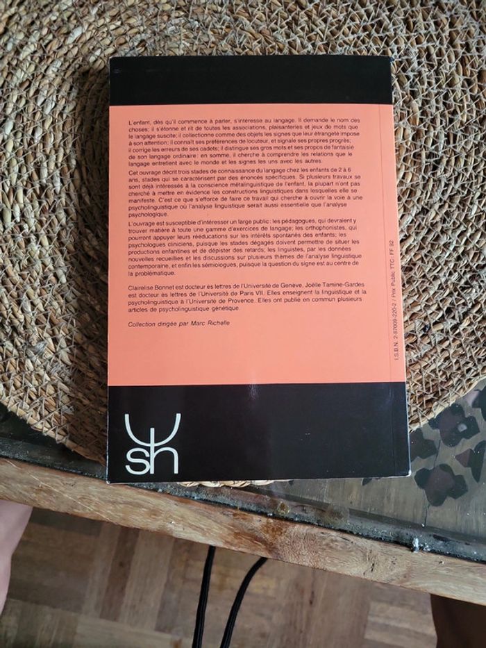 Cet ouvrage décrit trois stades de connaissance du langage chez les enfants de 2 à 6 ans, stades qui se caractérisent par des énoncés spécifiques. Les auteurs ont cherché à mettre en évidence les constructions linguistiques dans lesquelles la conscience métalinguistique de l'enfant se manifeste. Ils ouvrent ainsi la voie à une psycholinguistique où l'analyse linguistique pourrait être aussi essentielle que l'analyse psychologique. Cet ouvrage est susceptible d'intéresser un large public, des pédagogues aux sémiologues, en passant par les orthophonistes, les psychologues cliniciens et les linguistes. Neuf. D autres ouvrages sur ce sujet dispos dans mon dressing.
