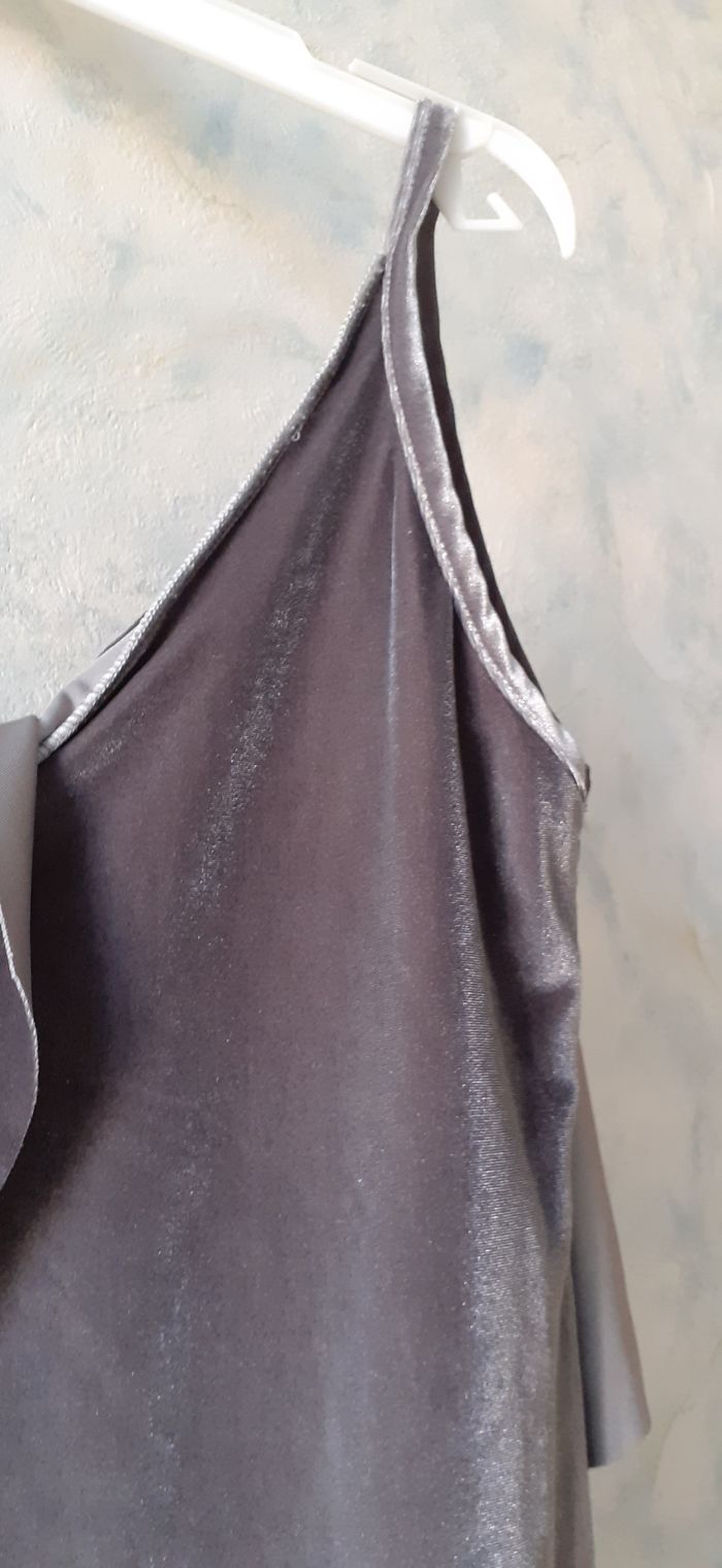 Vends un débardeur original en tissu synthétique velours qui ne se froisse pas, large volant devant et dans le dos, couleur gris uni, taille 40. Longueur sous aisselle : 42 cm.
