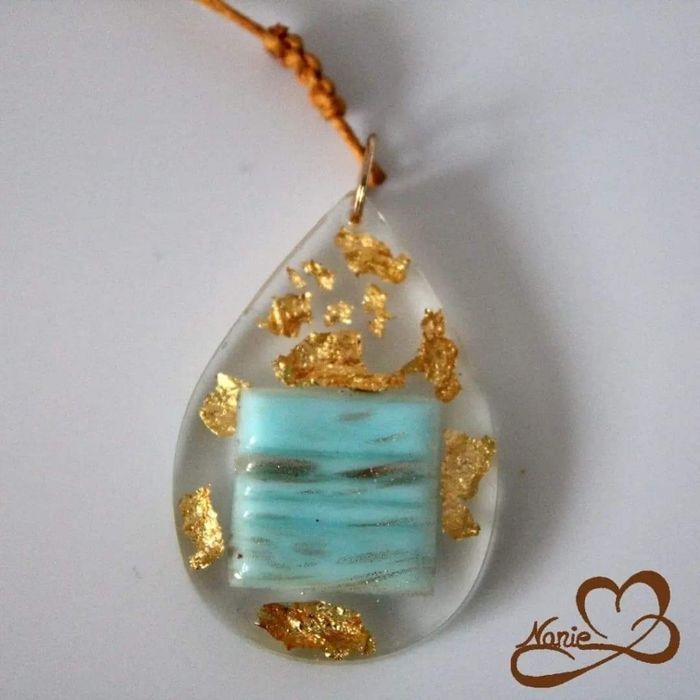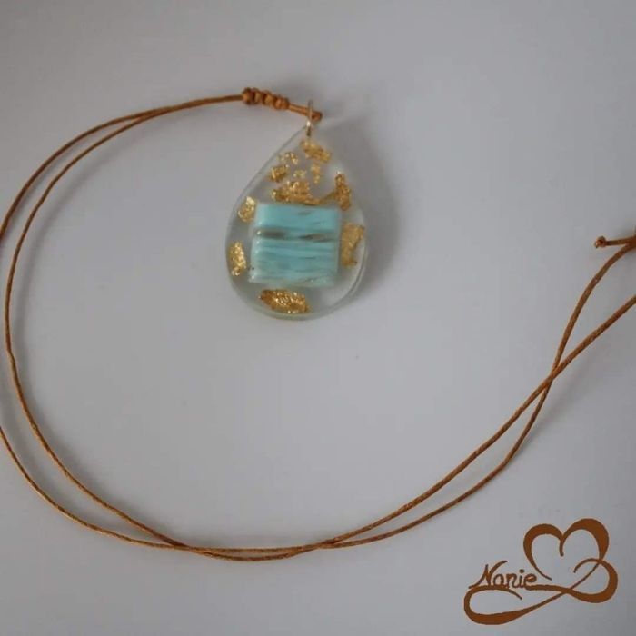 Pendentif bleu avec feuilles d'or modèle berlingot - photo numéro 2