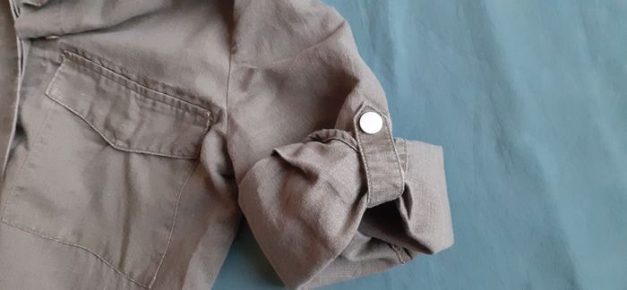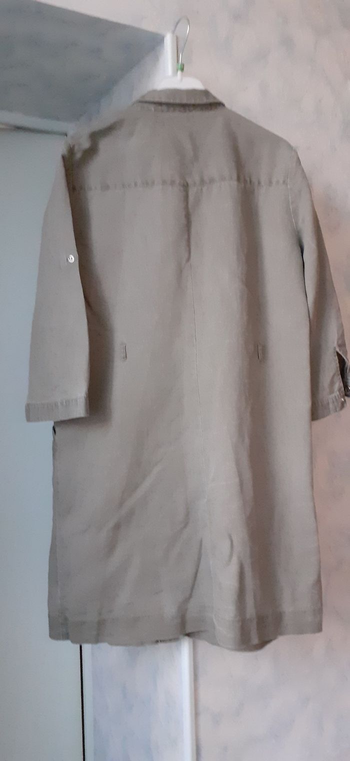 Vends une chemise longue en lin et coton boutonnée jusqu'à la base, manches 3/4 qui peuvent se retourner avec une patte de boutonnage, 2 poches latérales, 2 poches sur le buste, des passants pour une éventuelle ceinture, couleur kaki clair, marque Mango Casual Wear, taille L EUR (40-42). Longueur dans le dos : 86 cm Largeur aisselle à aisselle : 49 cm.