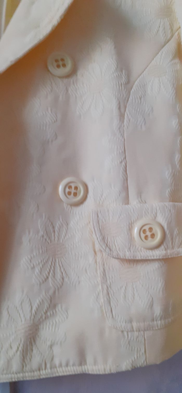 Vends un blazer court 65 % polyester, 35 % coton, doublé, manches fendues au niveau des poignets, couleur jaune vif (la photo ne rend pas bien la couleur) avec surimpressions, marque 1.2.3, taille 38. Longueur dans le dos : 50 cm.