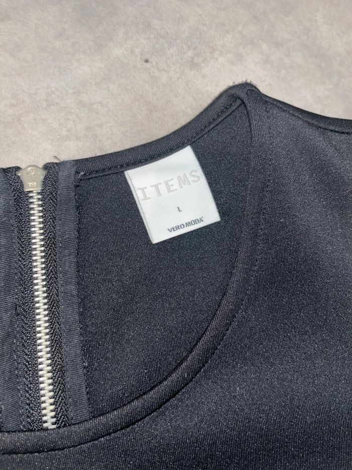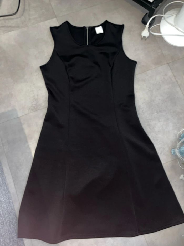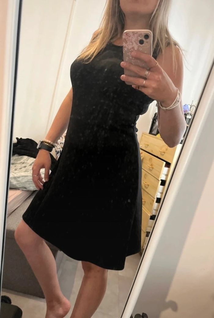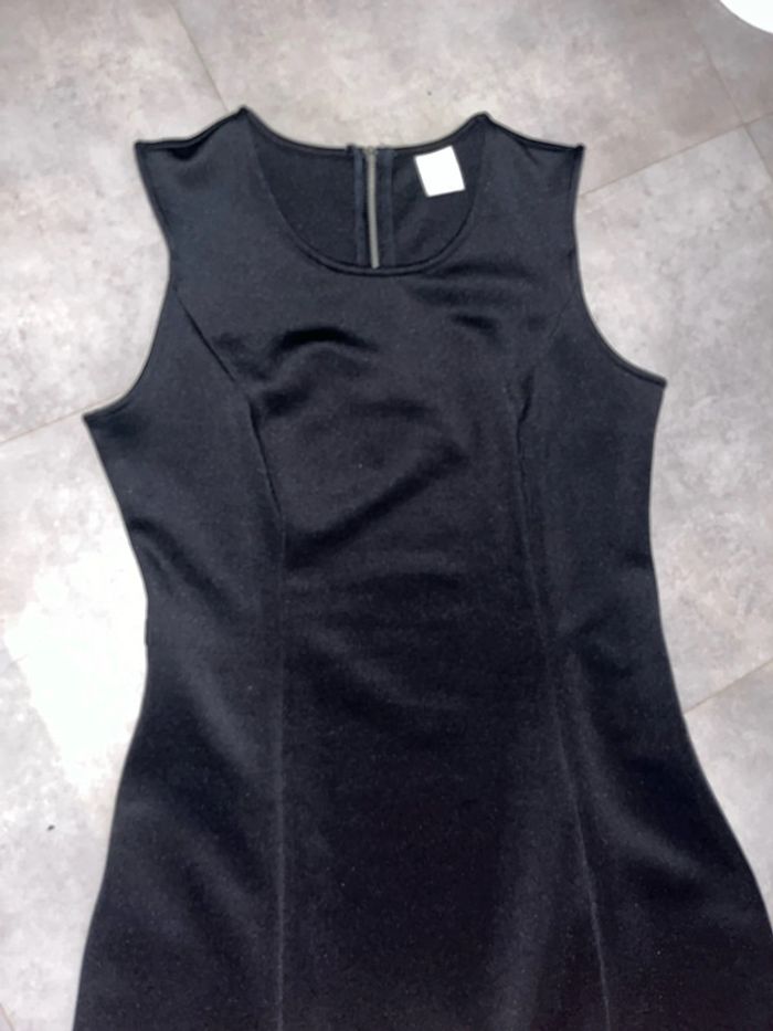 Robe noire mi longue. S’attache avec une fermeture en haut du dos. Je n’ai pas la ceinture qui va avec les petits passants. Mais une simple ceinture fine peut faire l’affaire. Notée L sur l’étiquette en haut mais notée M sur celle intérieure. Je pense se fier plutôt à un M.