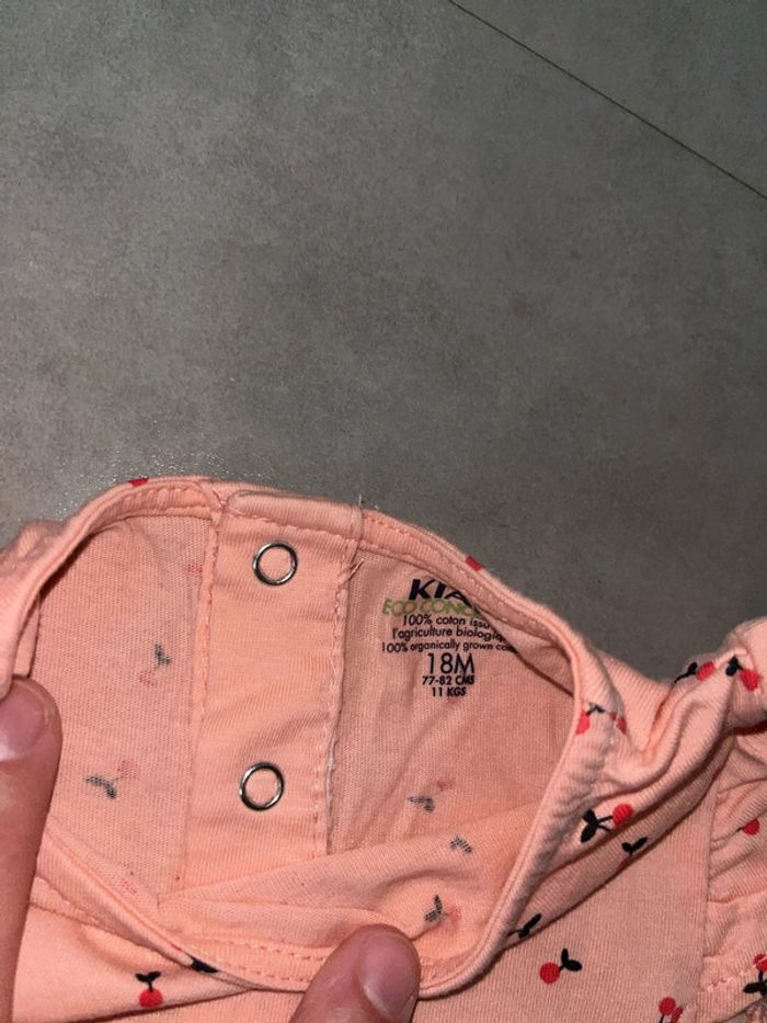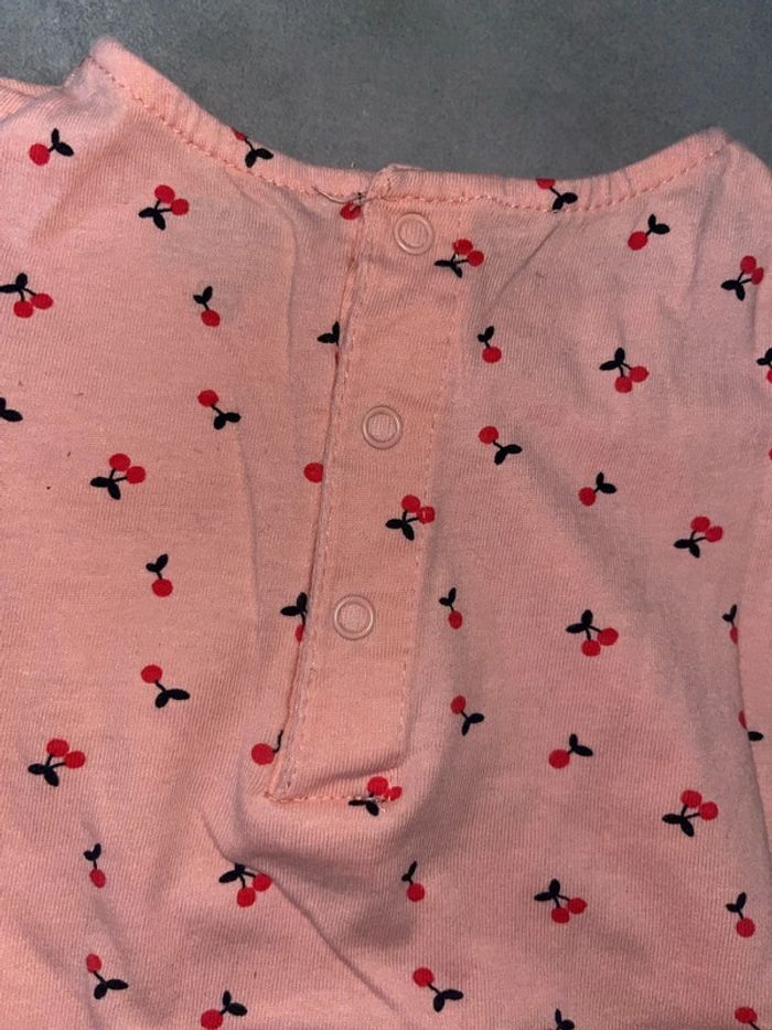 Tee shirt rose/abricot avec petites cerises. S’attache dans le dos avec des pressions. Taille 18 mois. 100% coton.