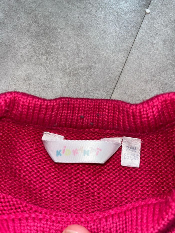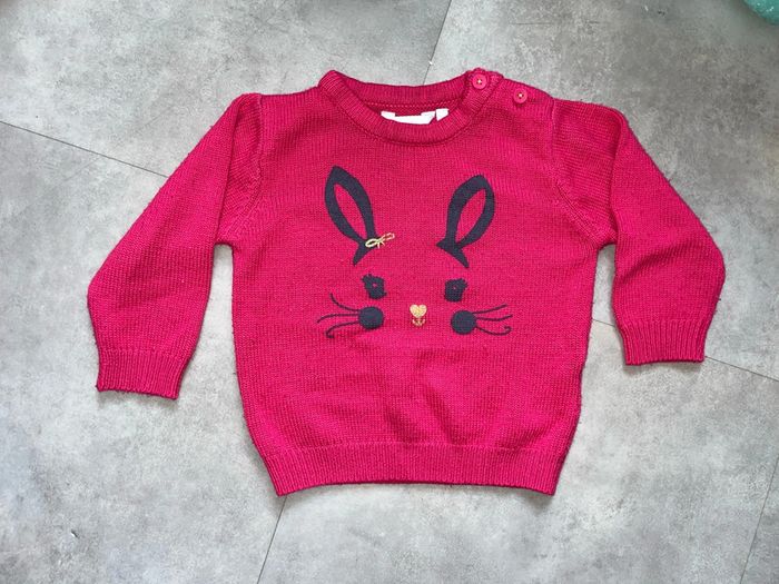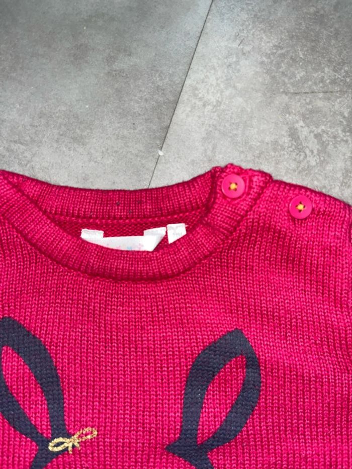 Petit pull en laine rose avec dessin lapin. (Fait quelques bouloches mais s’enlève facilement avec un rasoir à bouloches.) 24 mois