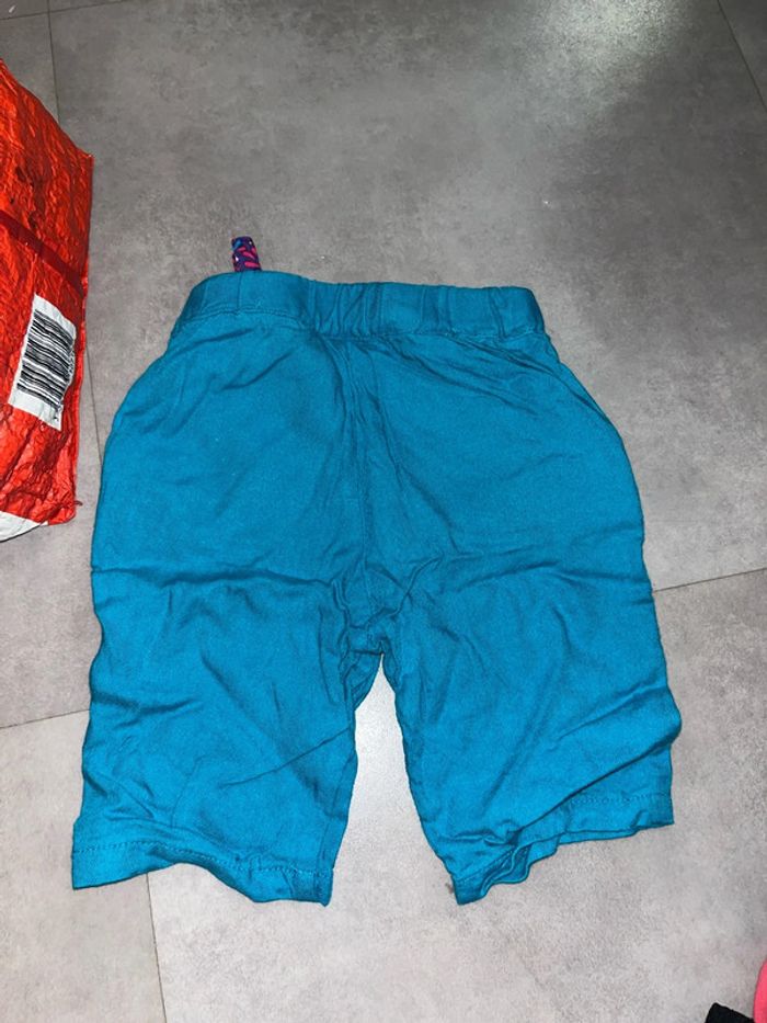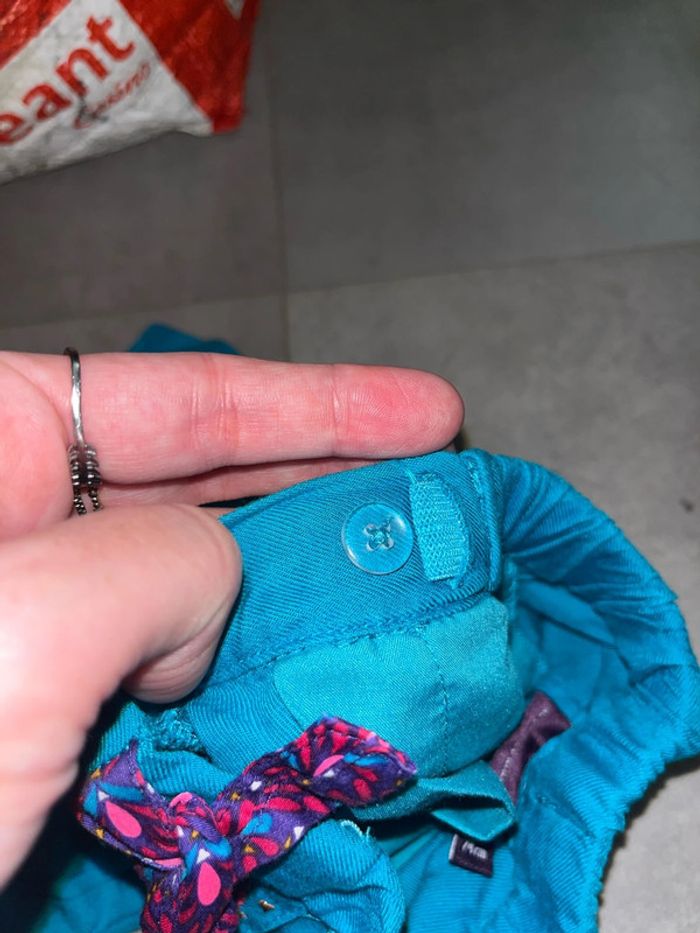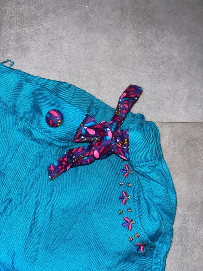 Pantacourt léger bleu avec noeud pour bébé fille. Petites poches sur les côtés. Taille 12 mois. Réglable à l’intérieur.