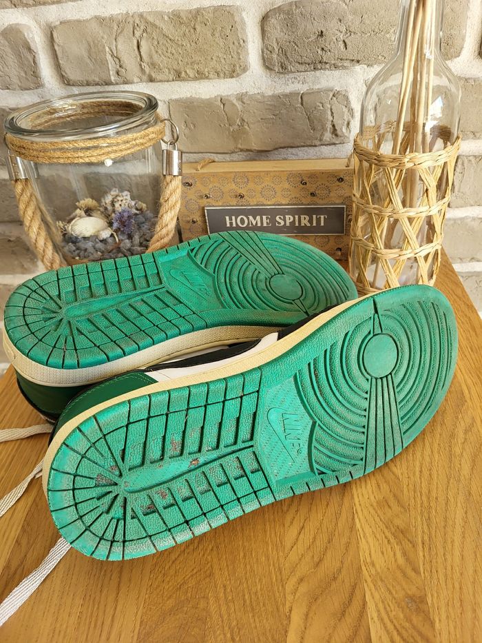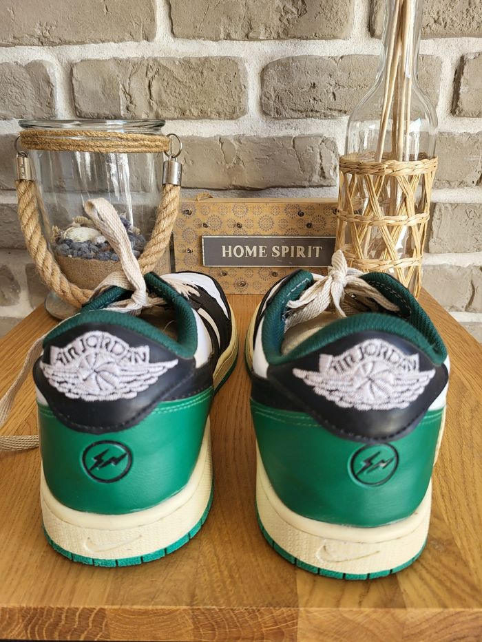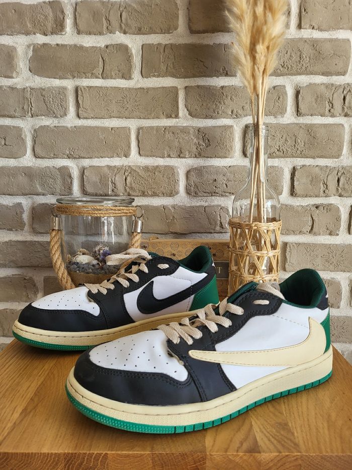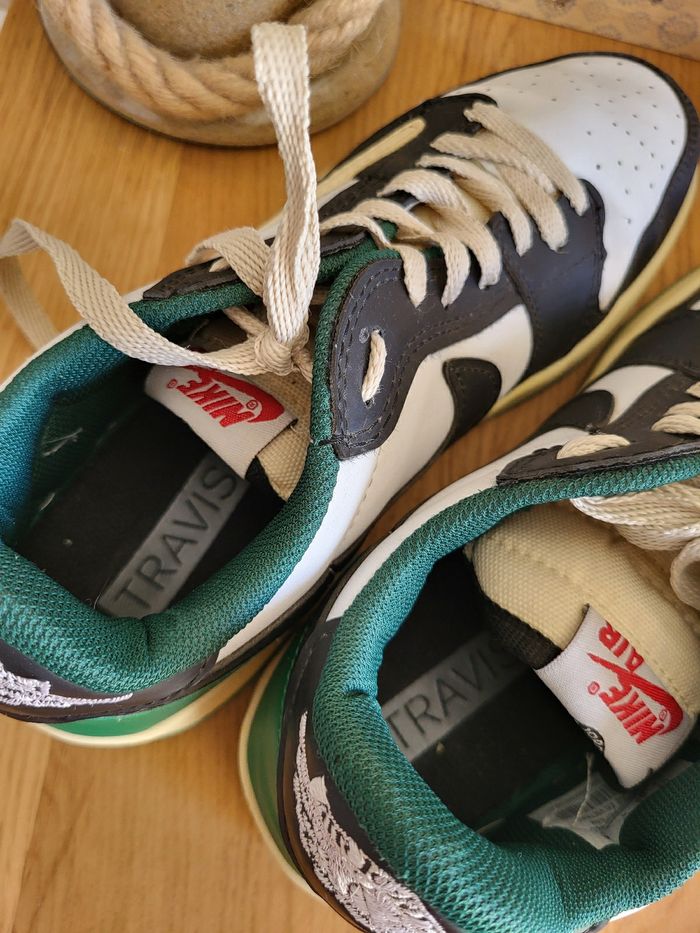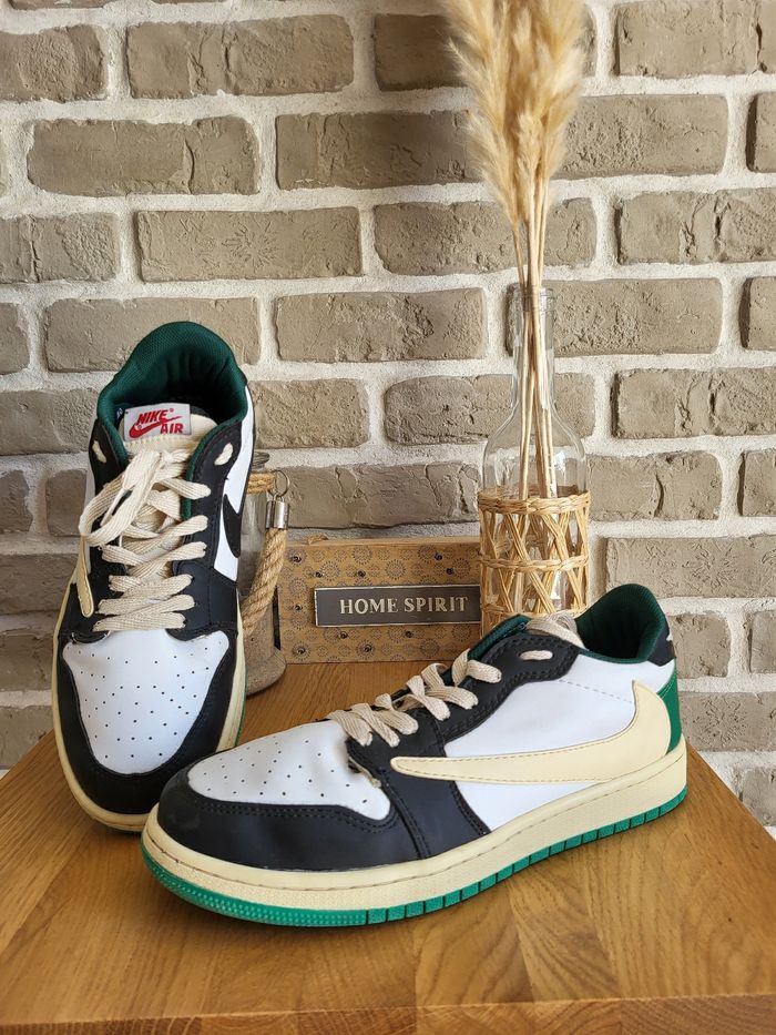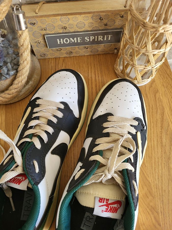 💝 Bénéficiez d'une réduction en créant lot dans mon dressing 🛍️ 🌸 Baskets Nike Jordan en très bon état, sans usure 🎀 En cuir blanc, noir, crème et vert 🍥 Taille 41 🪷 Modèle Travis low 🩷 Parfaites pour un look streetwear