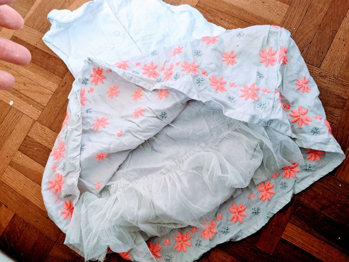 Très jolie robe de cérémonie col polo broderies fleurs 12 mois 74 cm Gemo Col claudine avec un cordon passepoil argent Fleurs brodées en relief sur toute la jupe Entièrement doublée Il y a un peu de tulle sur la doublure pour plus de volume (cf dernière photo) Très jolie pour la vie de tous les jours ou pour une cérémonie baptême, mariage, soirées etc Excellent état, peu porté Gémo 12 mois 74 cm #yipin_bebe_12mois_fille #yipin_bebe_12mois