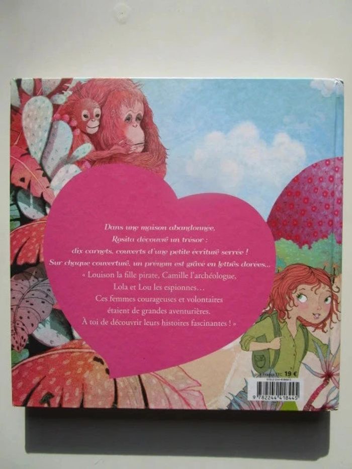 Dans une maison abandonnée, Rosita découvre dix carnets, couverts d' une petite écriture serrée. Ce sont les récits de dix vies extraordinaires, celles d 'aventurières ! Sur chaque couverture, un prénom est gravé en lettres dorées... Louison la fille pirate, Camille l 'archéologue, Lola et Lou les espionnes... Rosita va découvrir les histoires fascinantes de ces femmes courageuses et volontaires ! Éditeur ‏ : ‎ Lito 133 pages Dimensions ‏ : ‎ 24.5 x 1.6 x 24.6 cm Livre en très bon état #aventurière