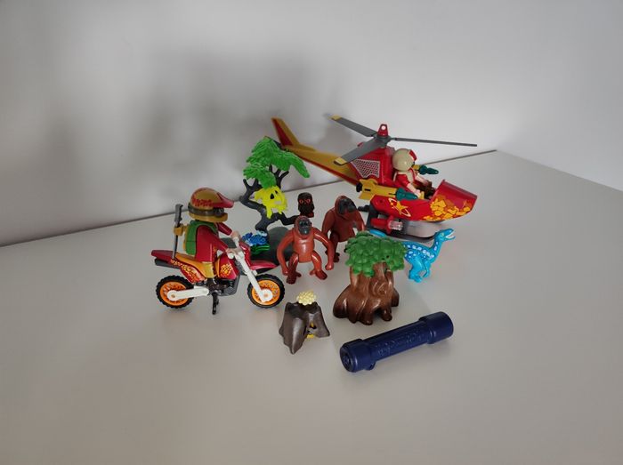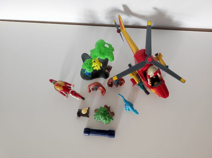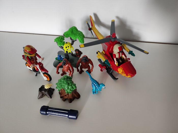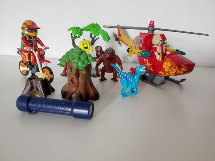 Lot de Playmobil avec hélicoptère, moto, petit dinosaure et autres accessoires.