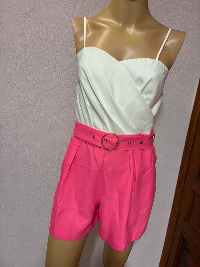 Combi short rose flash avec ceinture et haut blanc Bretelles amovibles, possible de le porter en version bustier Taille 38 Neuve jamais portée (valeur étiquette 69,99€)
