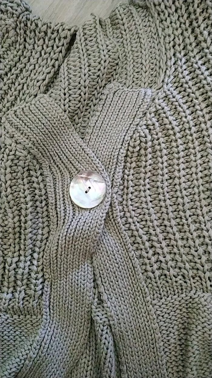 Très bon état. Peu porté. Fermeture par un gros bouton nacré au niveau du col. Beige foncé. Étiquette de la taille enlevée. C'est un 44/46