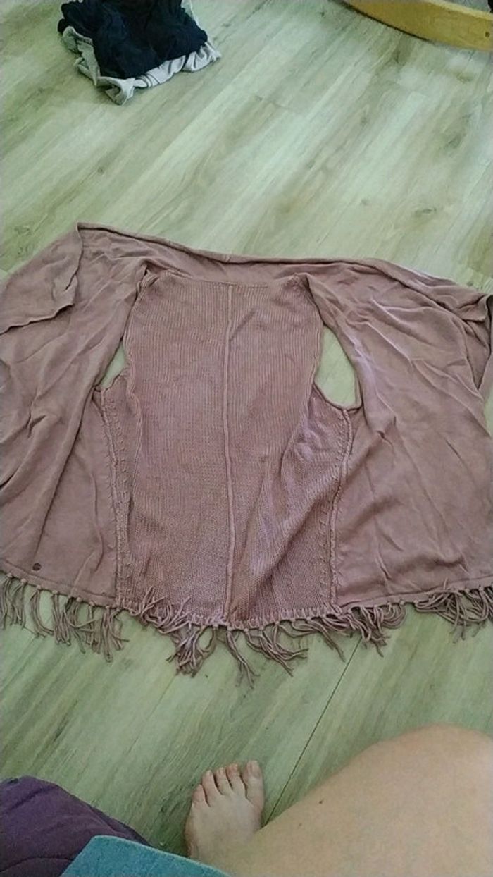 Joli gilet sans manche en très bon état. Je l'ai porté ouvert par dessus un t shirt mais on peut aussi imaginer y accrocher une grosse épingle pour le tenir fermé. Taille xl (44 +/-). Vieux rose