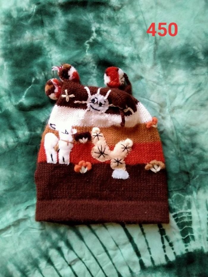 Bonnet couleur automnale 3 pompons. En manque 1! Convient pour 2 ans