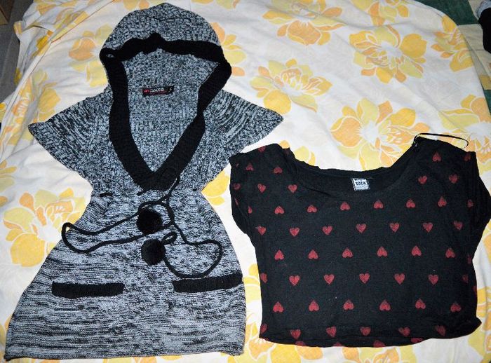 lot 4 vêtements femme (ou fille) peu portés, en très bon état avec 1 T-shirt long NEUF couleur CHOCOLAT et non noir comme laisse supposer la photo