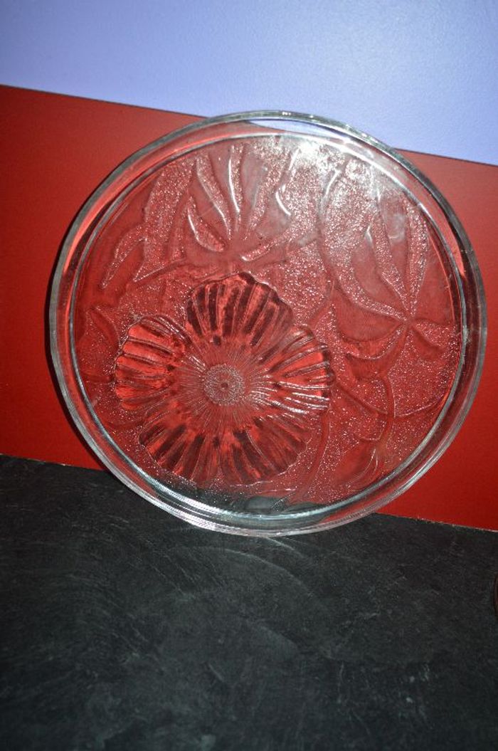 plat à tarte en verre de 32cm de diamètre avec motifs ciselés - assez lourd - disponibilité de 3 (pour 15,00€ le lot) - très peu servis
