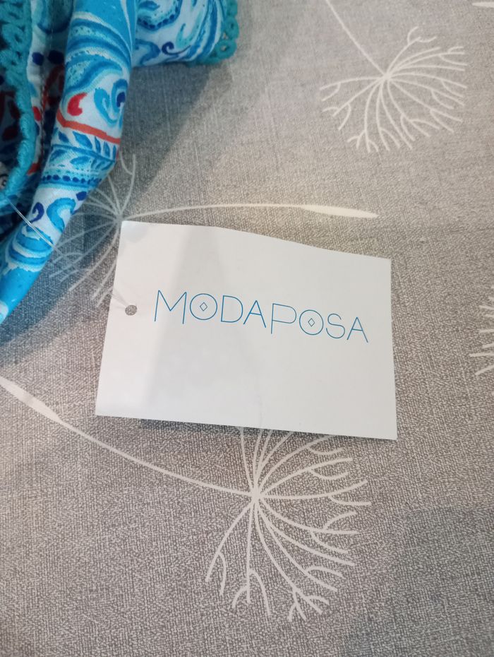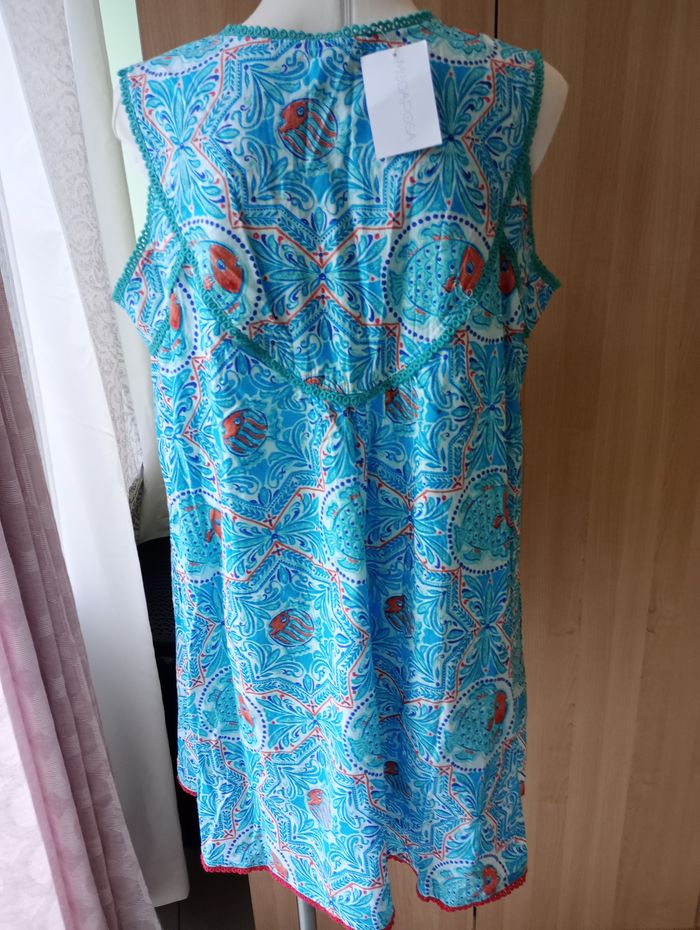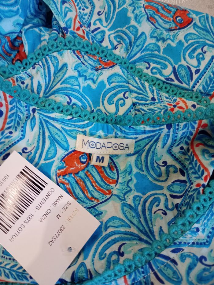 Robe tunique à motifs, dans les tons bleus et rouges. Ample et légère. 100% coton. Longueur : 90 cm. Largeur entre aisselles : 56 cm. Taille : M. Marque : ModaPosa. Neuve avec étiquette.