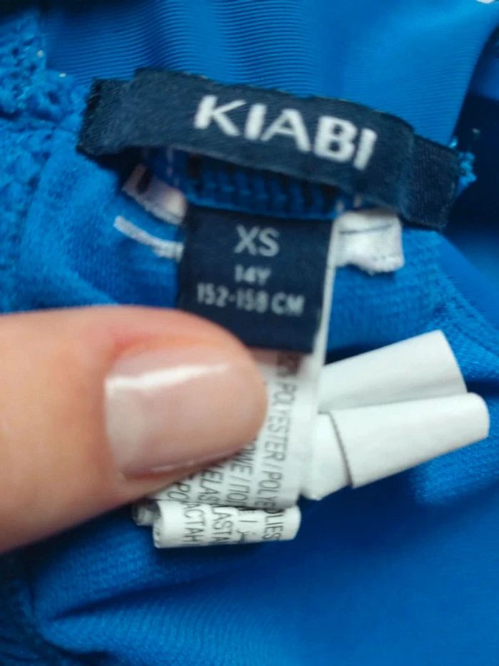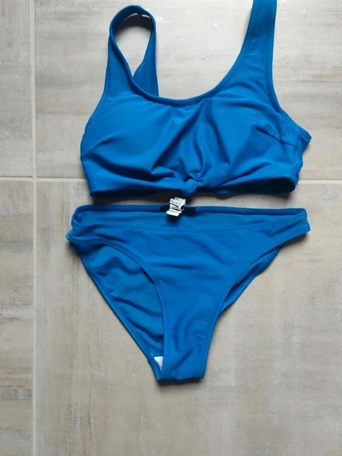 Maillot de bain deux pièces bleu avec haut en brassière. Marque "Kiabi". Haut taille XS et bas taille S. Un autre maillot de bain de la même taille et marque est disponible dans mon dressing n'hésitez pas à aller voir.
