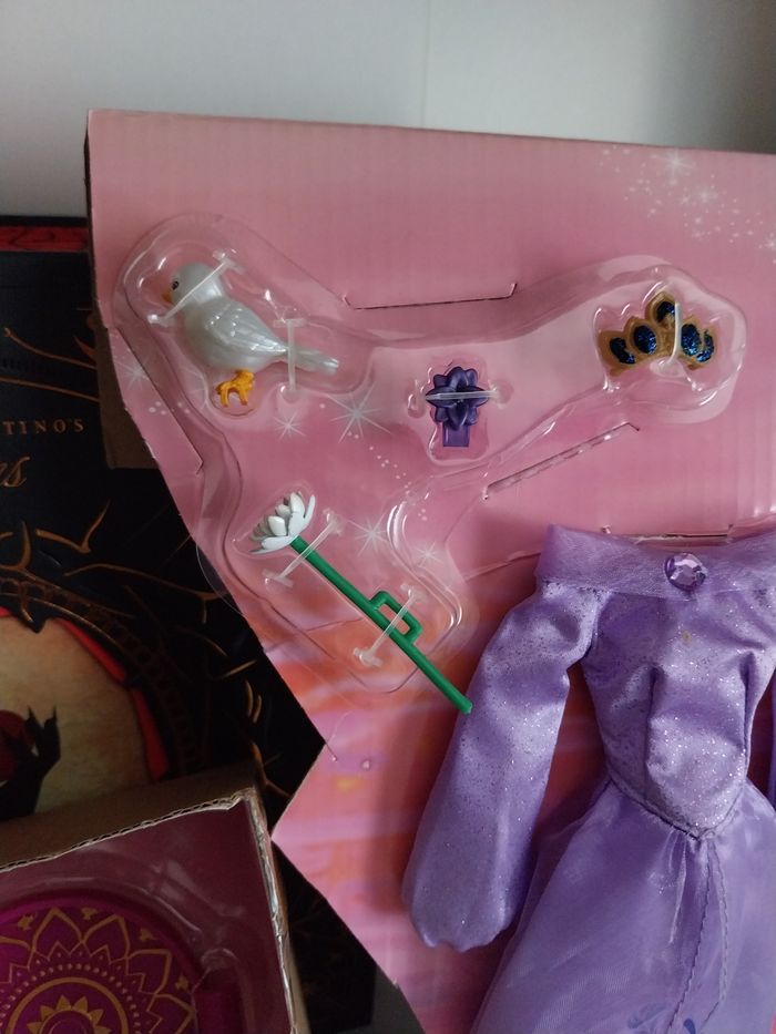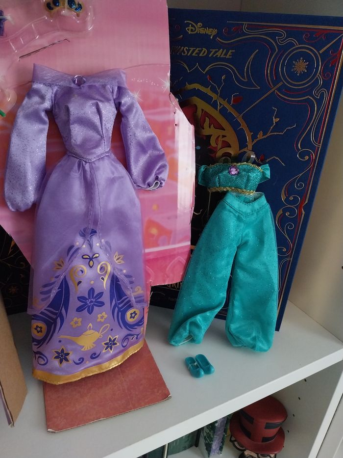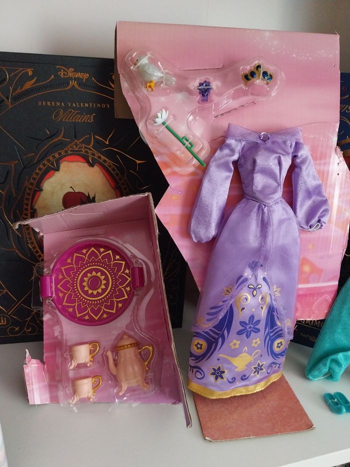 Je vends une robe violette de ce rêve bleu pour une poupée Jasmine + accessoires couronne pince à cheveux fleur colombe et service à thé de la princesse + sa tenue classique bleue/verte composée du haut, pantalon et des babouches vertes.