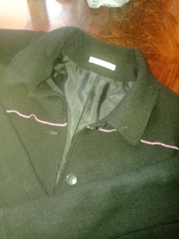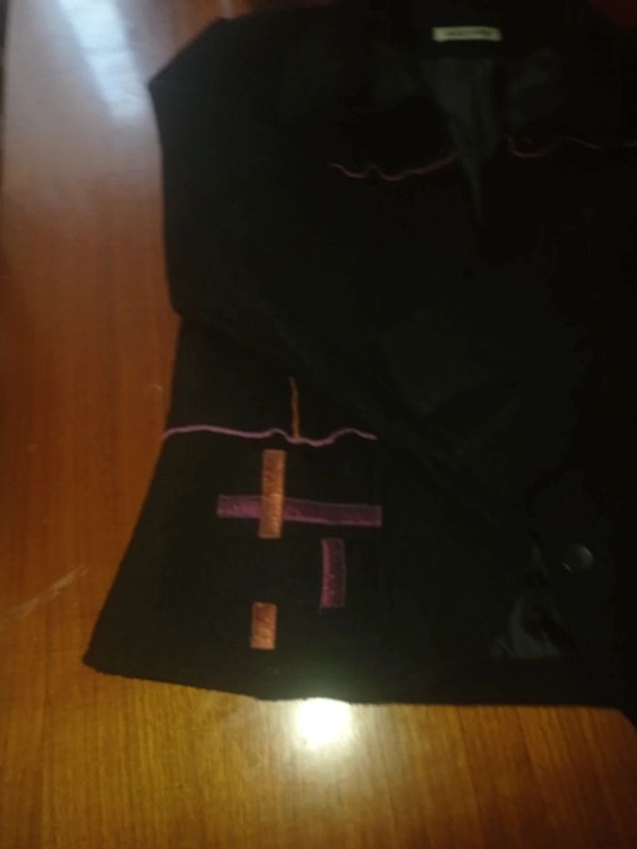Blazer, avec deux petites poches à l'avant. Laine et doublure en polyester. Petit motif devant et derrière. Manches trois quarts. 4 boutons pour fermer.