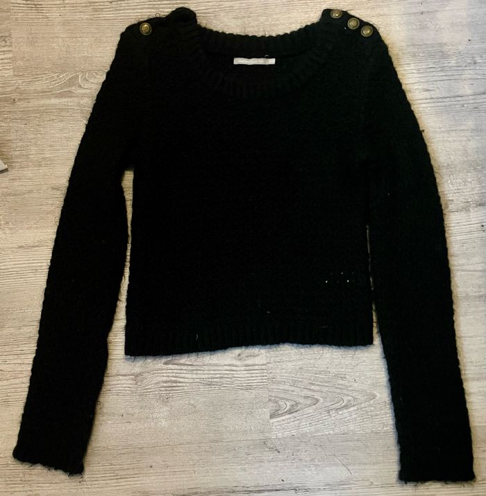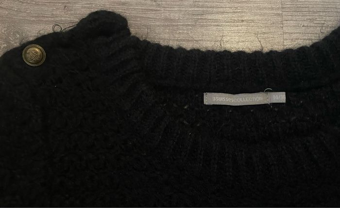 Pull à mailles larges de la marque 3 Suisses Collection Taille 34/36 Dimensions largeur aux épaules 38 cm, longueur 51 cm Il manque 2 boutons sur l’épaule droite Occasion, bon état