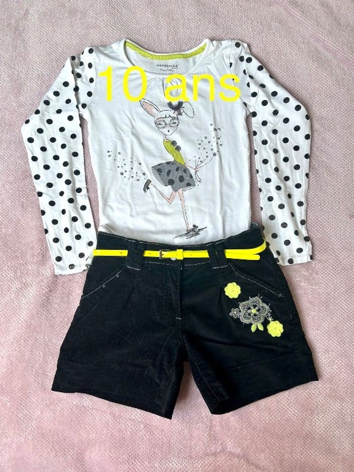 Short noire orchestra 10 ans, tissu type velours qui accroche un peu les fibres cela se voit plus sur la photo qu’en vraie 98% coton, il est en très bon état . J’offre les 2 t-shirts ils sont en bon état mais ont bien été portées , la ceinture est avec , la couleur est entre le jaune et vert flashie