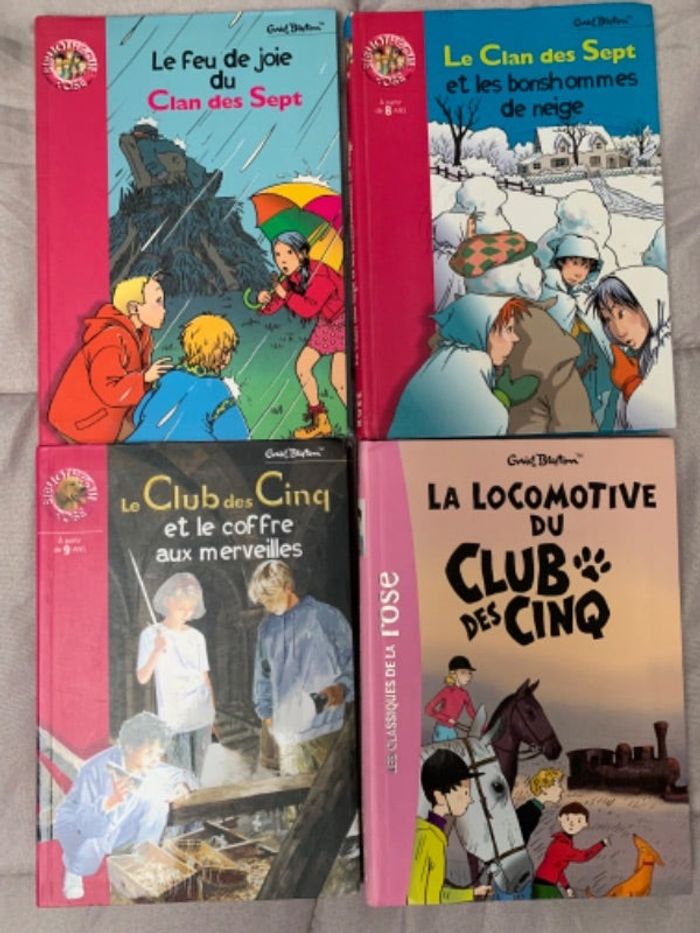 2 livres le clan des sept bibliothèque Rose . « et les bonhommes de neige «  « le feu de joie » bon état 2 le club des cinq « le coffre aux merveilles » »la locomotive » bon état