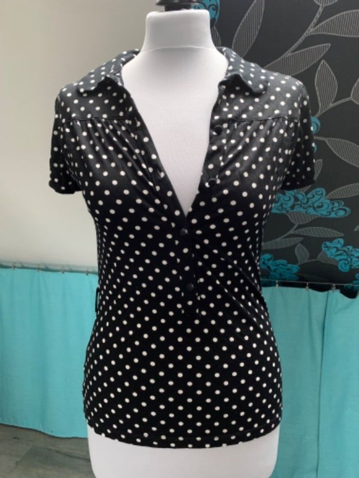 Haut Mango noir à poids blanc. Très bon état mais le fil sur la manche un peu décousu taille 36