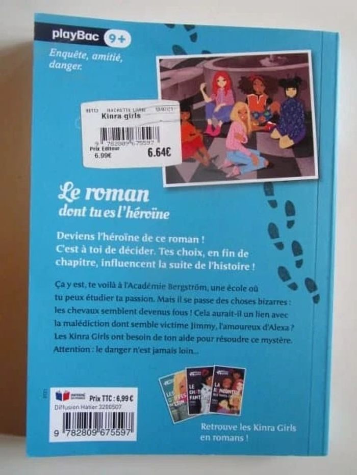 Deviens l’héroïne de ce roman ! C’est à toi de décider. Tes choix, en fin de chapitre, influencent la suite de l’histoire ! Ça y est, te voilà à l’Académie Bergström, une école où tu peux étudier ta passion. Mais il se passe des choses bizarres : les chevaux semblent devenus fous ! Cela aurait-il un lien avec la malédiction dont semble victime Jimmy, l’amoureux d’Alexa ? Les Kinra Girls ont besoin de ton aide pour résoudre ce mystère. Attention : le danger n’est jamais loin… Éditeur ‏ : ‎ Play Bac 136 pages Âge de lecture ‏ : ‎ 8 - 12 ans Dimensions ‏ : ‎ 12.4 x 1.5 x 17.8 cm Livre en parfait état Je vends d'autres livres des Kinra Girls #phil_peg_kinragirls #kinragirls #livredonttueslheroine