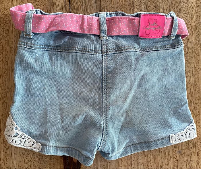 Short avec dentelle 24 mois Ceinture en tissus 1 bouton pression Tache devant voire photo Ceinture à intérieur 68% coton 27% polyester 2% polyester Ceinture rose 100% coton