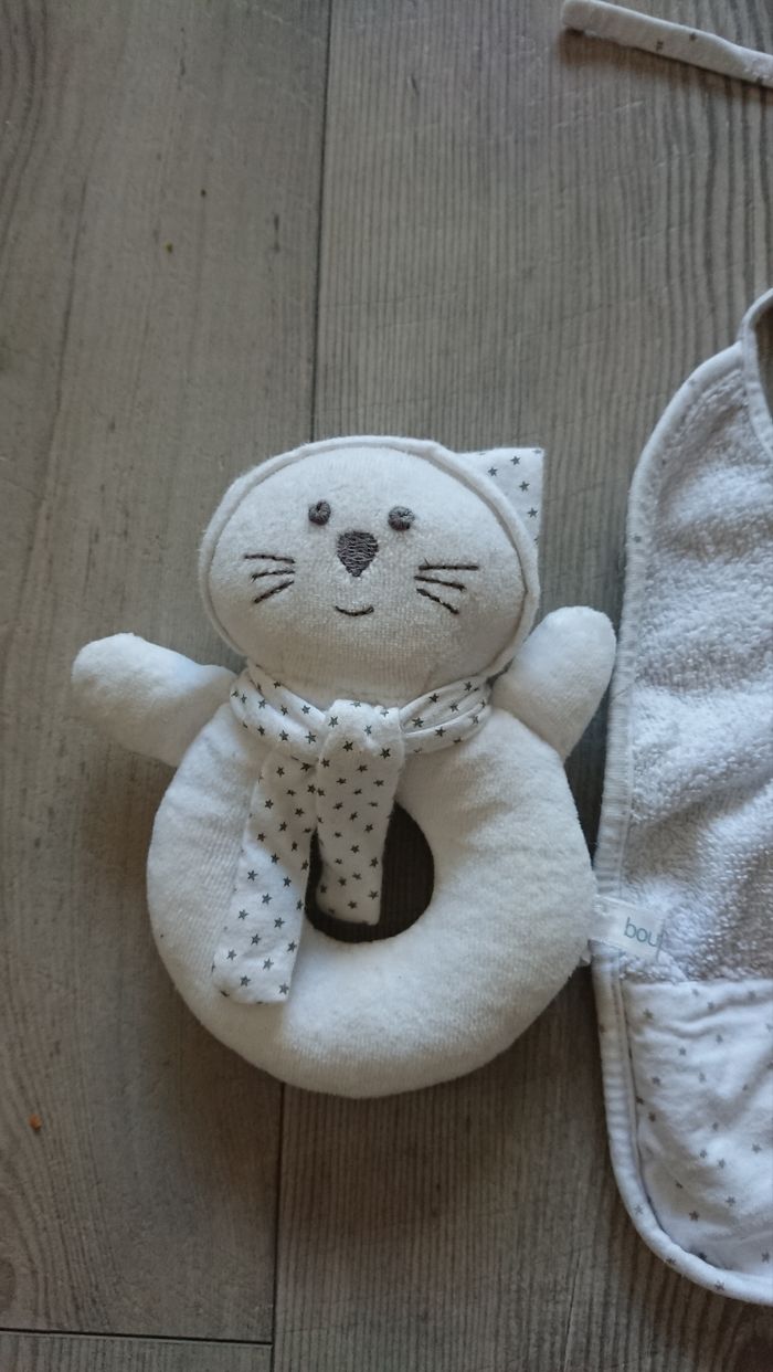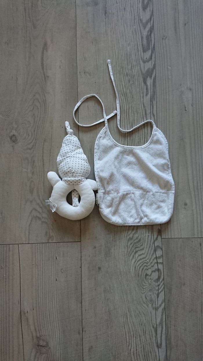 Lots avec un bavoir blanc et une petite peluche style hochet avec les mm détails étoiles Idéal pour cadeau de naissance En excellent état