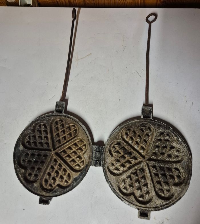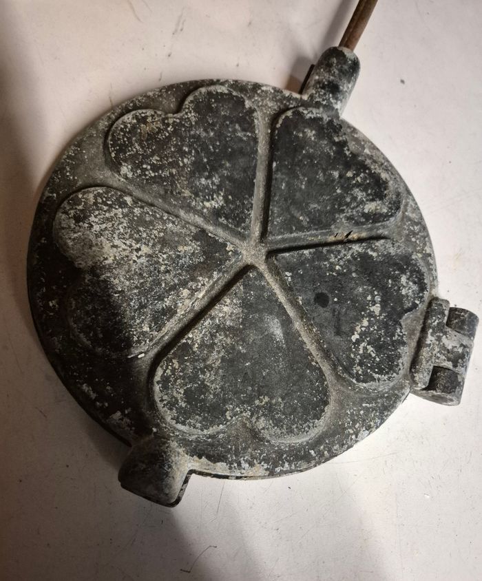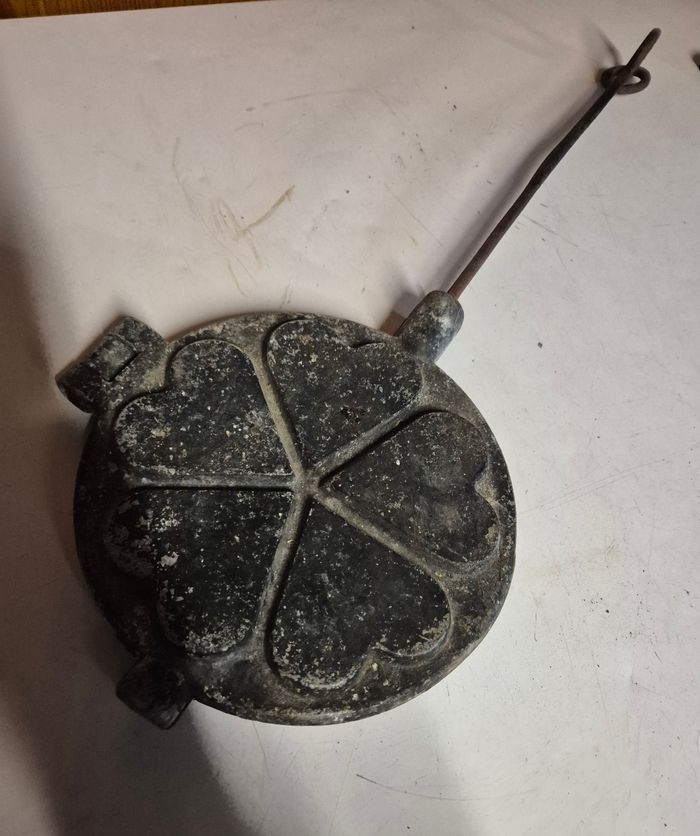 Gaufrier à main ancien En fonte Moule cœur Diamètre 20cm Longueur total 53cm Tres bon etat #gaufrier #gaufrierancien #gaufrierfonte #gaufriercoeur #mouleagaufres #mouleagaufrecoeur