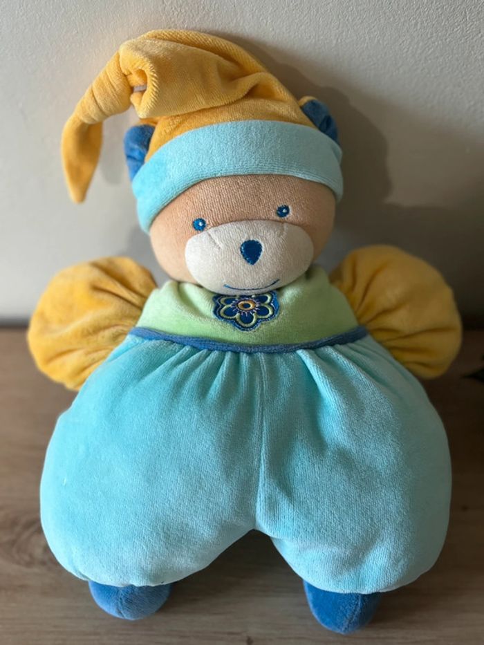 Doudou peluche ours bleu vert bonnet jaune fleur nounours - photo numéro 1