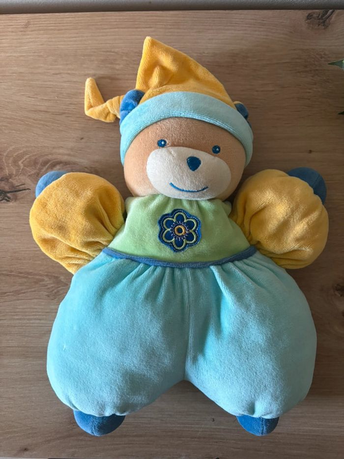 Doudou peluche ours bleu vert bonnet jaune fleur nounours