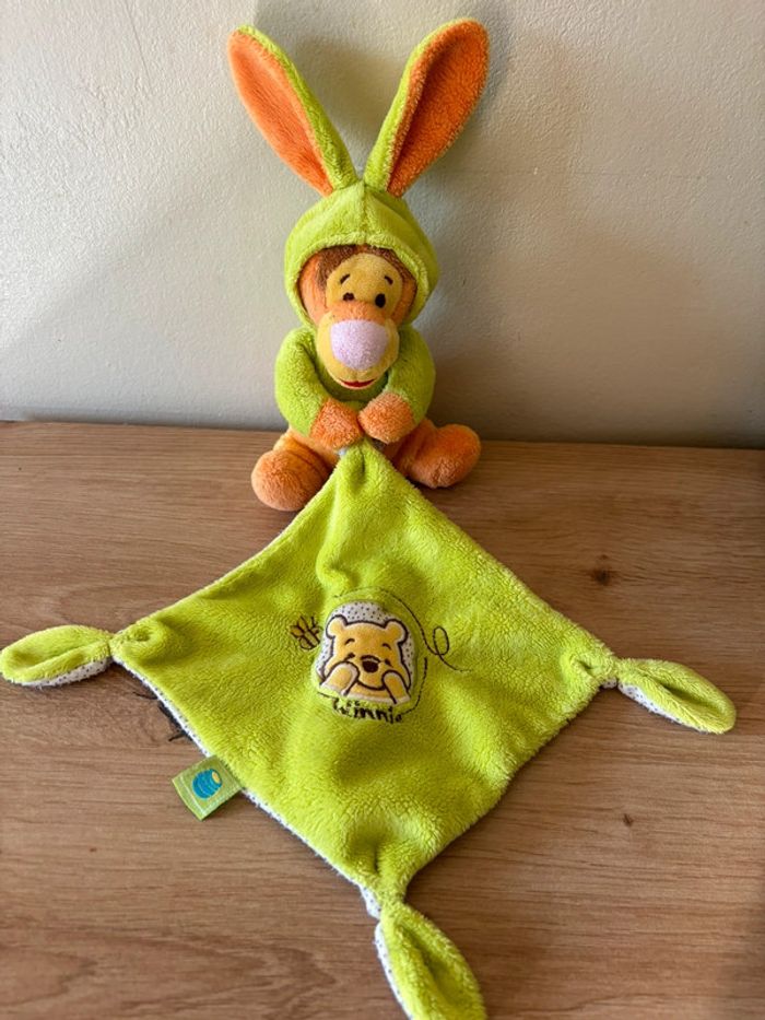 Doudou peluche Tigrou déguisé en lapin vert orange mouchoir Winnie Disney