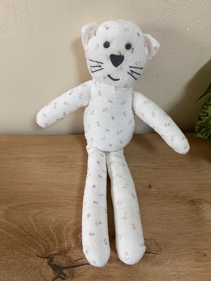 Doudou peluche chat blanc motifs fleurs boutchou - photo numéro 1