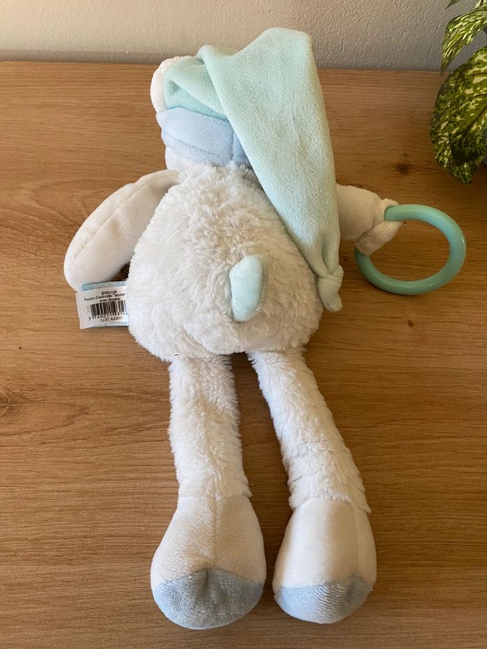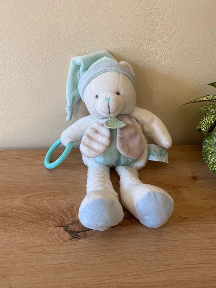 Doudou peluche ours pantin éveil pouet anneau grelot blanc vert baby nat - photo numéro 1
