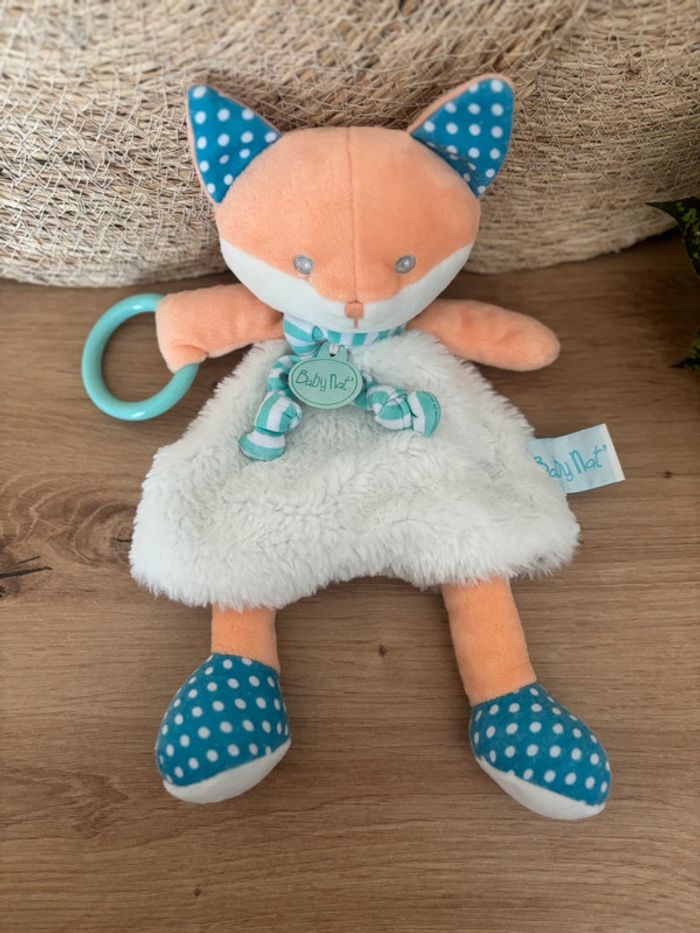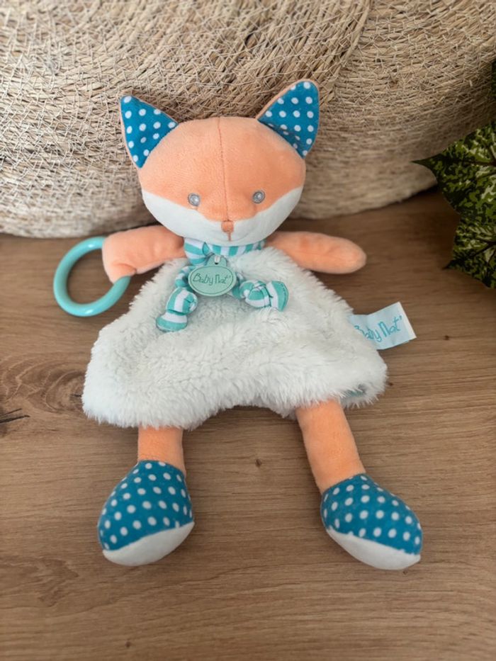 Doudou renard poupi blanc orange bleu anneau baby nat - photo numéro 1