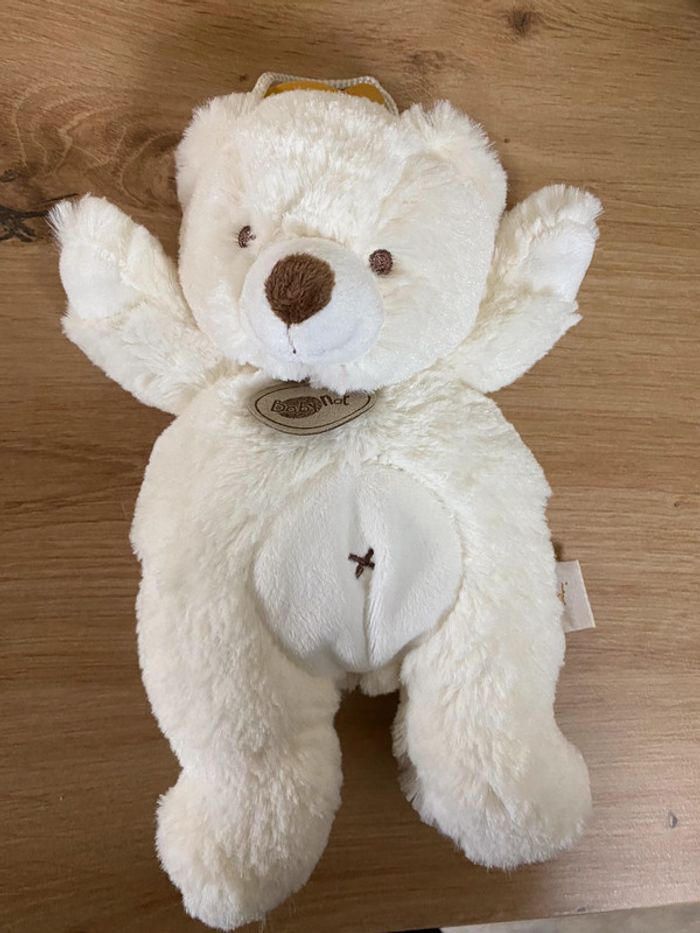 Doudou peluche ours blanc fourrure croix nombril baby nat neuf - photo numéro 1