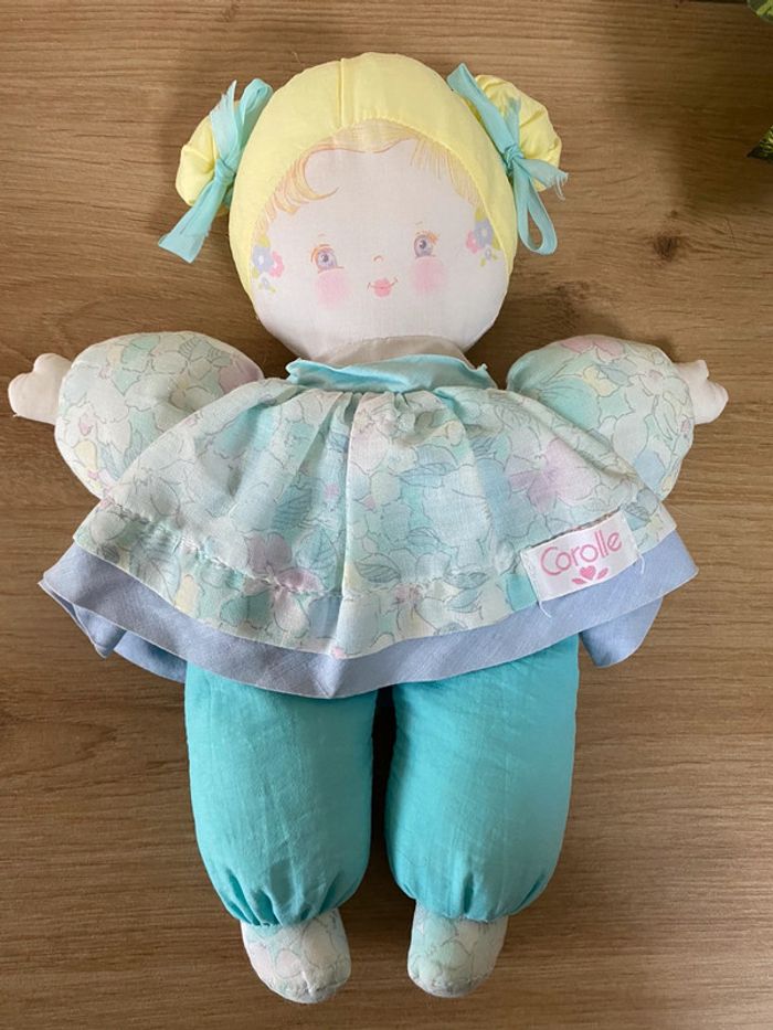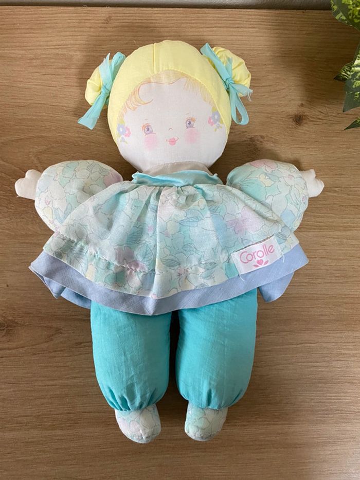 Doudou peluche ancienne poupée tissu robe fleurs corolle - photo numéro 1