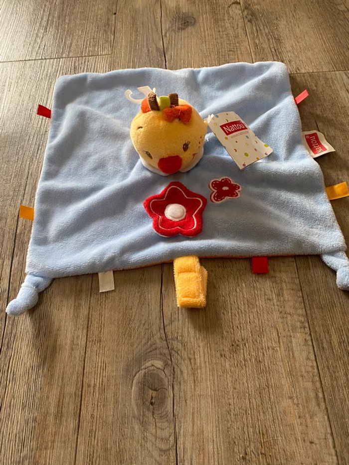Doudou plat garçon bleu fleur rouge attache sucette nattou