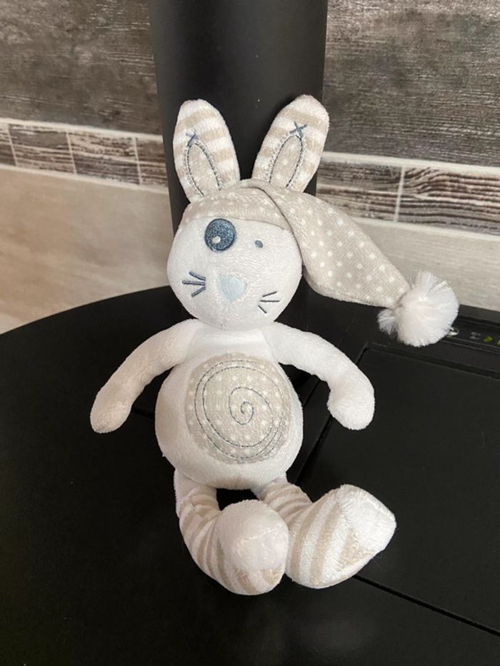 Doudou peluche lapin blanc beige gris bonnet pompon tape à l œil tao