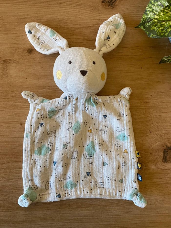 Doudou plat lapin blanc lange motif maison tape à l œil - photo numéro 1