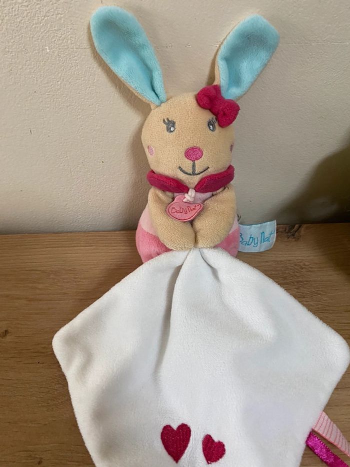 Doudou peluche lapin rose mouchoir blanc coeur baby nat - photo numéro 1