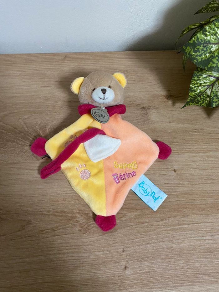 Doudou plat ours jaune saumon rouge super tétine baby nat - photo numéro 1