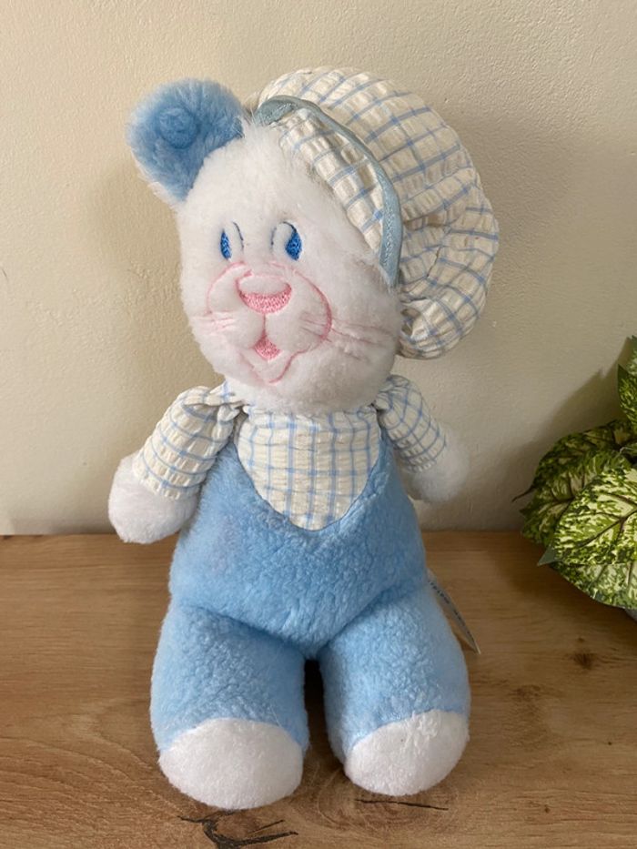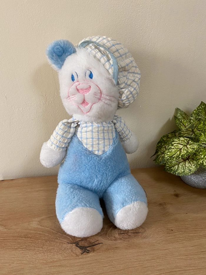 Doudou peluche chat chien casquette béret bleu blanc nounours vintage - photo numéro 1