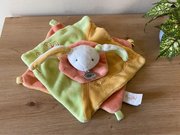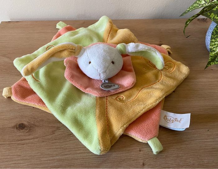 Doudou plat lapin carré superposé vert orange saumon baby nat - photo numéro 1