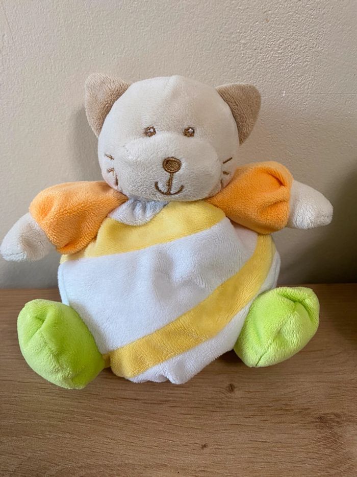 Doudou peluche chat boule orange blanc jaune vert grelot les bébés d elysea